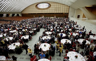 Papež František poté pozval všechny účastníky mše svaté, včetně jejich doprovodu z charitativních organizací, na slavnostní oběd, organizovaný v aule Pavla VI. (foto), přilehlých papežských kolejích a jídelnách pro chudé. K iniciativě se připojily také desítky restaurací v historickém jádru Věčného města.